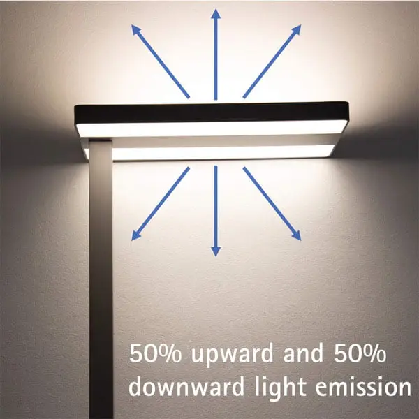Var izmantot kā tiešo galda apgaismojumu un netiešu telpas apgaismojumu. Gaismas padeve 50% uz augšu un 50% uz leju.
