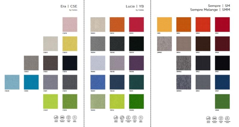 Polsterēta sēde un atzveltne. Pieejami dažādu krāsu un veidu audumi.