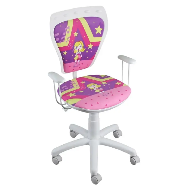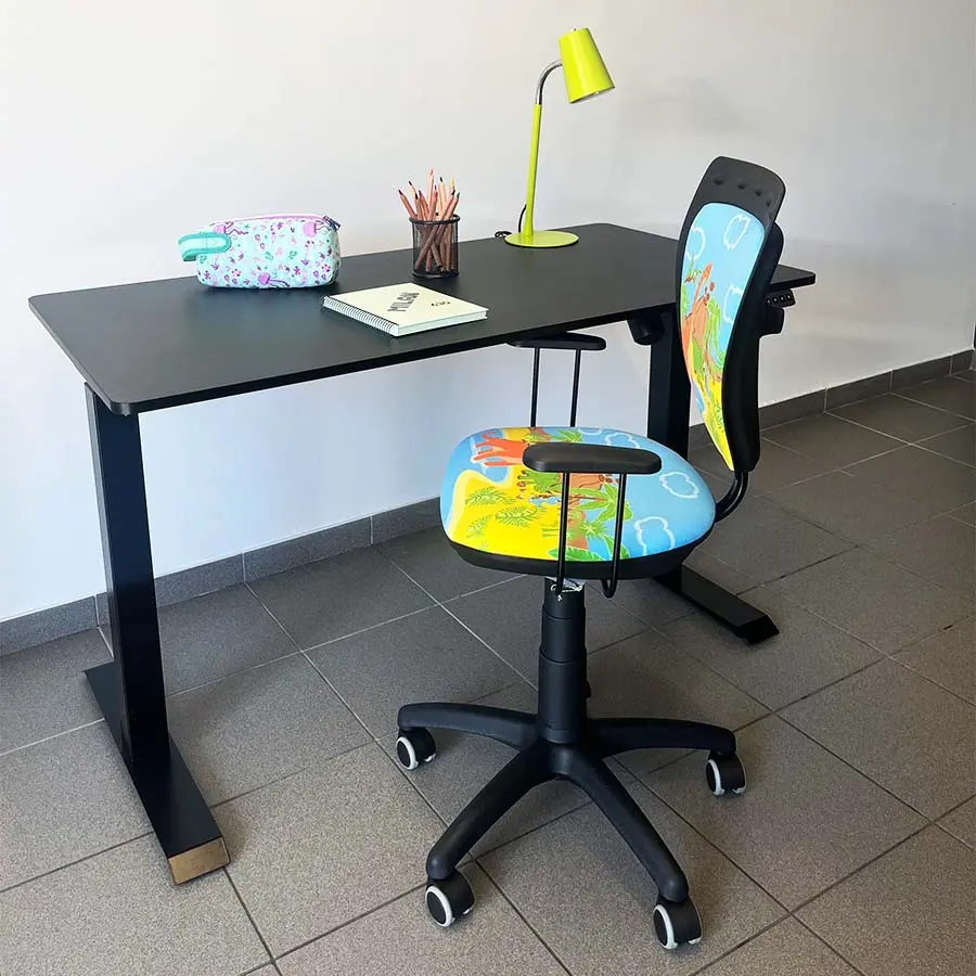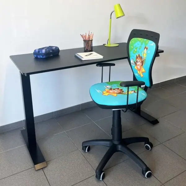 Motora trokšņa līmenis <30db Ātrums 38mm/sek Slodzes cikls: 2 minūtes nepārtraukta darba/ 18 minūtes miera režīms Nav nepieciešamas papildus izmaksas par piegādi un montāžu, to visu var paveikt saviem spēkiem- pieejama montāžas instrukcija latviešu, krievu un angļu valodās. Gan rāmis, gan galda virsma iepakota vienā kartona kārbā 70.5x16.5x125 cm, kas sver 31 kg. Ja vēlaties piegādi un montāžu uzticēt mums, savstarpēji vienosimies par laiku un cenu. Ražotāja garantija 5 gadi 2) Bērnu krēsls Cartoons GTP Bērnu krēsls ar regulējamu atzveltnes augstumu. Regulējams sēdekļa augstums (425-555 mm), regulējams sēdekļa dziļums. Fiksēti roku balsti. Iespējami dažādu krāsu audumi. Stabila, melna poliamīda piecstaru pamatne ar riteņiem. Paredzēts bērniem līdz 45 kg.