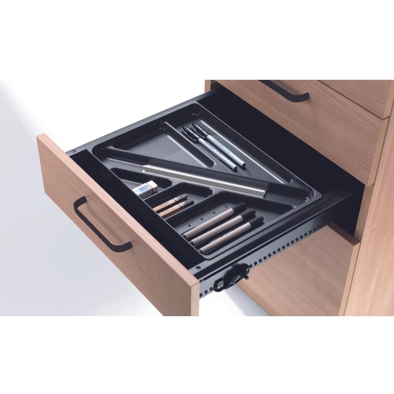 Augšējā atvilktne ar plastmasas ieliktni rakstāmgalda piederumiem, 2 vienāda augstuma atvilktnes un apakšējā atvilktne dziļāka
